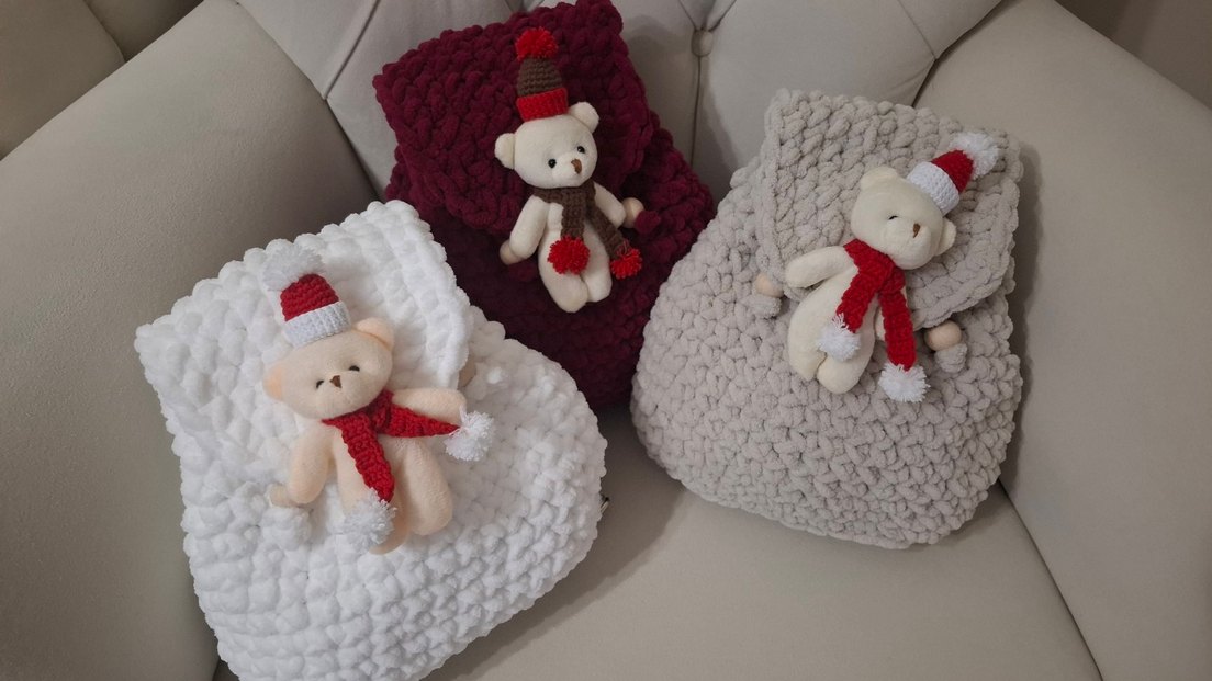 Bordo ve gri, beyaz renklerde kadife ipten yapılmıştır. Yumuşak dokulu ve oyuncak ayıcık süslemelidir oldukça hafiftir.