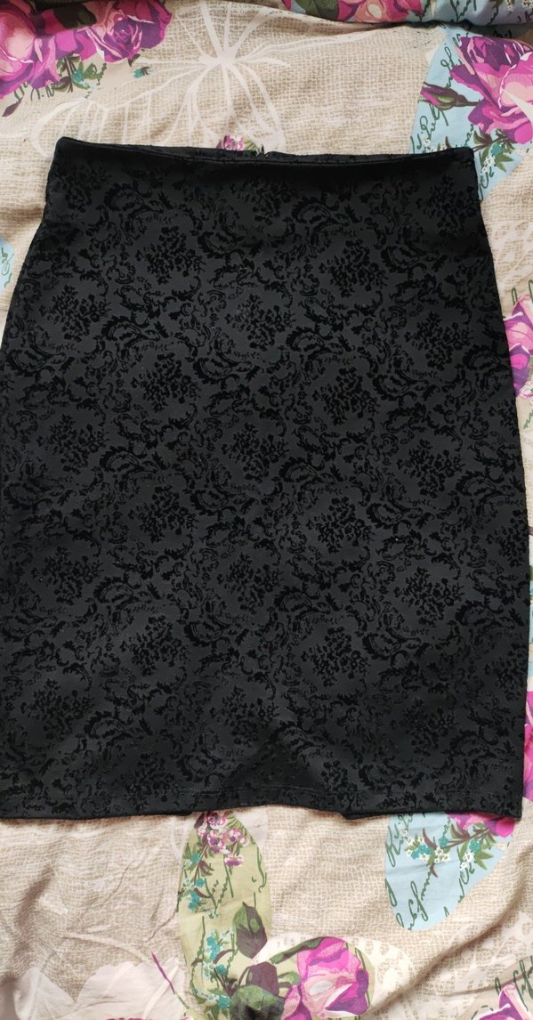 Siyah midi kalem etek, kadife desenli ve vücuda oturan kesimiyle gotik ve iddialı bir ofis tarzı sunar.