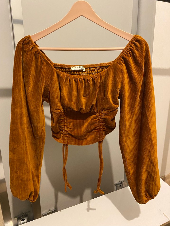 Kadınlar için drapeli, uzun kollu ve tekne yaka, yumuşak kadife kumaştan yapılmış parlak kahverengi tonunda fitted bluz. Croptur. Özel günlerde kurtarıcı bir parça, biraz kısa olduğu için satıyorum, iyi günlerde kullanın.