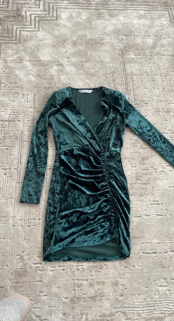 Koyu turkuaz kadife kumaştan, drapeli ve V yakalı, uzun kollu, vücuda oturan kadın gece elbisesi. Romantik akşamlar için ideal. Hiç giyilmedi daha koyu ama fotolarda açık çıktı