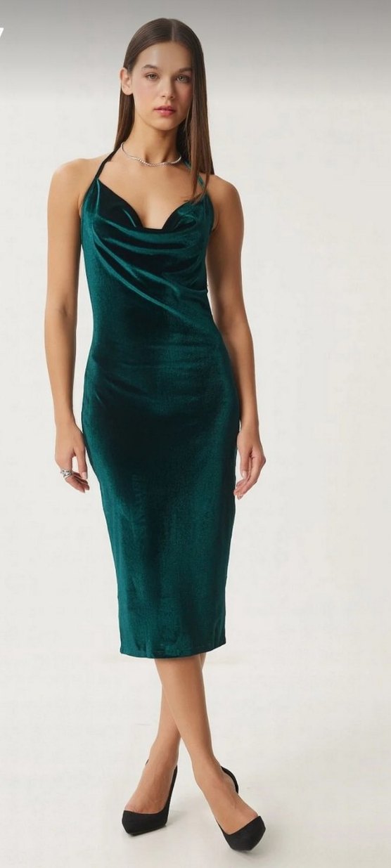 Parlak turkuaz kumaştan, drapeli V yakalı, ince askılı ve vücuda oturan uzun elbise, romantik akşamlar için uygundur.