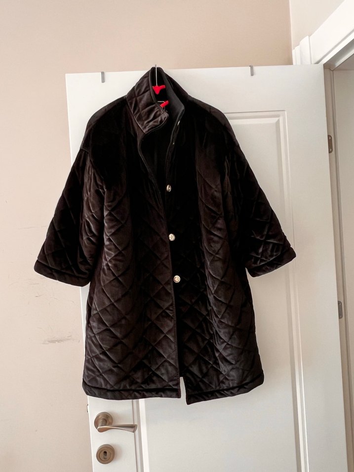 ince hafif parlak kadifeDüğmeli siyah midi ceket, notalı yaka ve uzun kolludur. Rahat kesimi ve yumuşak dokusuyla günlük kullanıma uygundur.