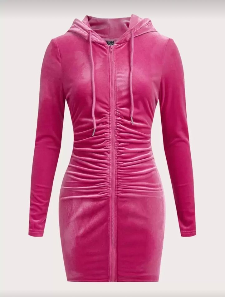 Kadınlar için parlak pembe, fermuarlı, kapüşonlu ve uzun kollu, beli büzgülü mini boy dar kesim ceket. Cesur sokak stili ve romantik akşamlar için uygun.