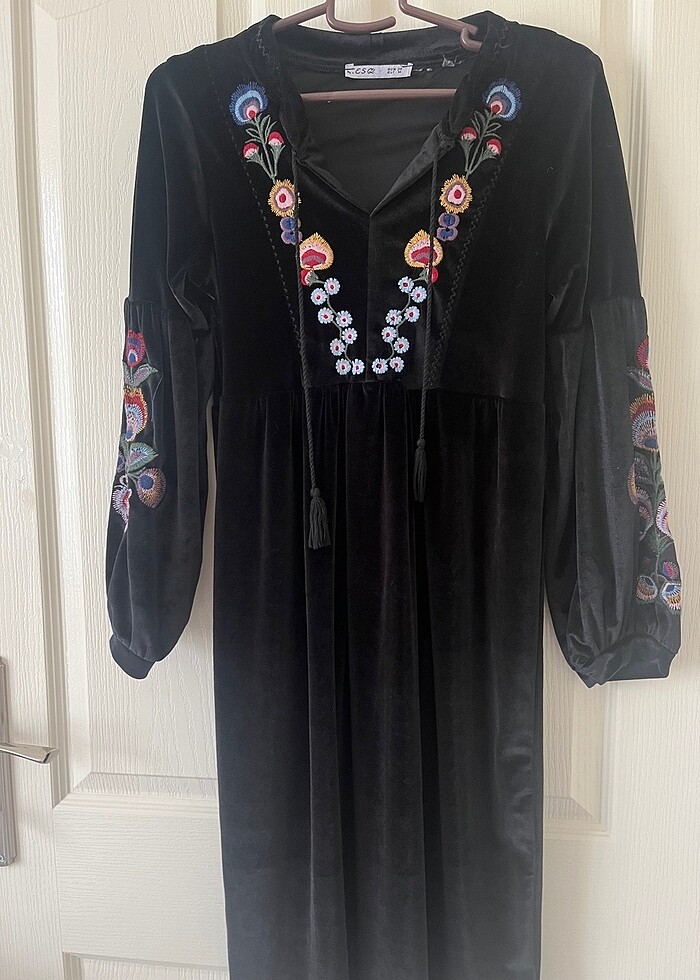 Nakışlı, kadife elbise. 1 kez kullanılmıştır. İki kol arası 41 cm, boy 99 cm’dir. Dokusu yumuşacıktır. Marka temsilidir. ürünüdür.