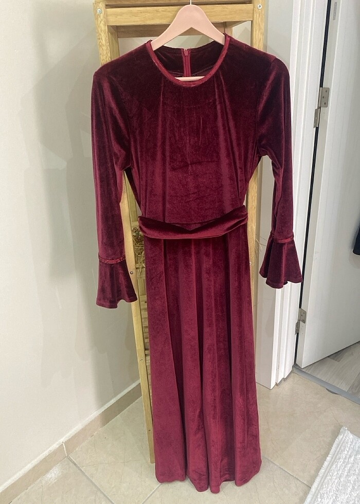 1. Kalite kadife kumaş abiye elbise. 2 defa giyildi. Tüy toplamaz. 38-40 beden uyumludur. Astarlıdır. Boyu 130 cm
