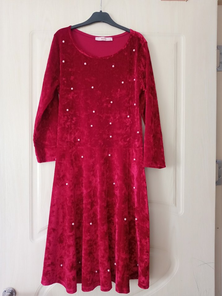 kırmızı kadife İncili kapri kol kısa kadın elbise