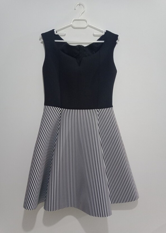 KADİFE#ELBİSE#YELEK#KABAN#CEKET#ÇANELBİSE Siyah beyaz ronda cizgi desenli alt kısmı çan modleinde kalın askılı yazlık elbise.