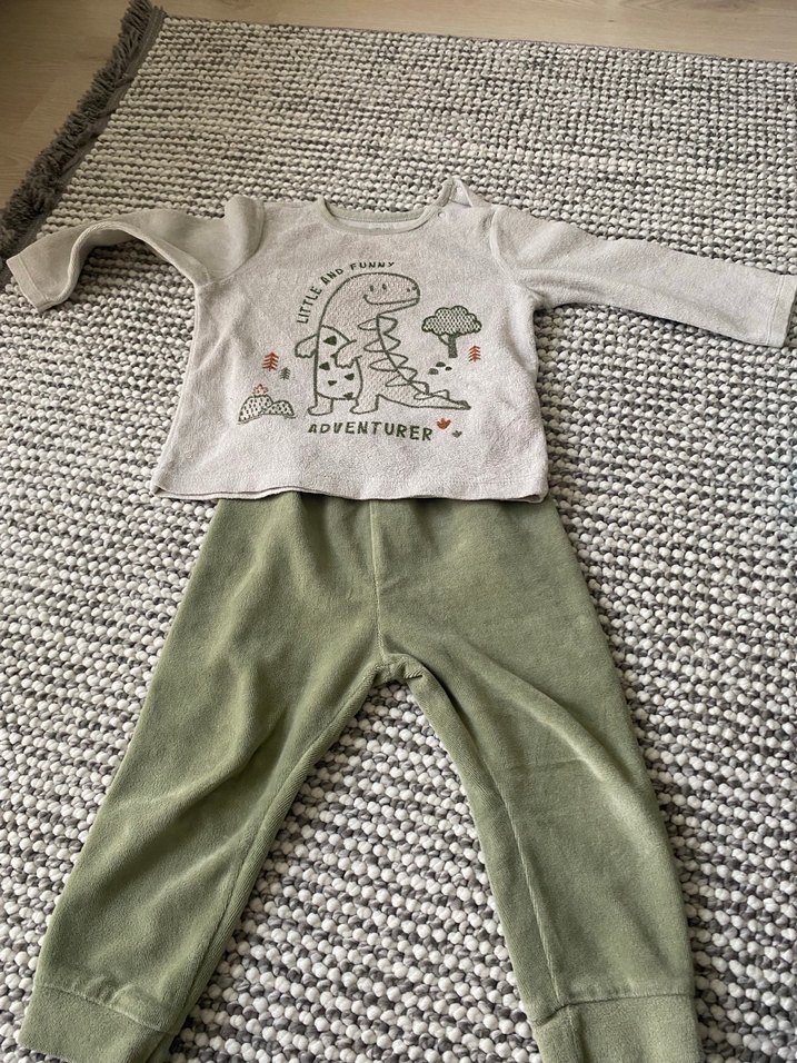 Yeşil uzun kollu tişörtü, maceracı dinozor baskısı ve yumuşak yeşil pantolonu ile çocuk takımı. Sokak stili için uygun.