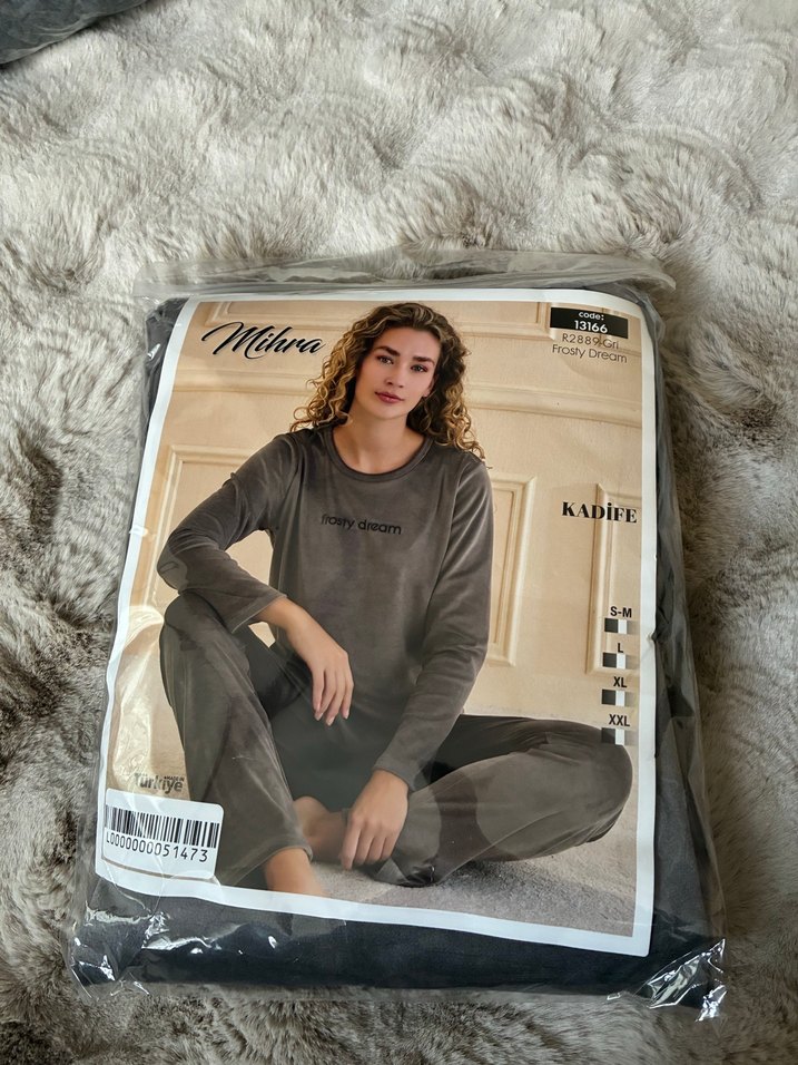 Kadife kumaştan, uzun kollu ve midi boy gri kadın pijama takımı. Rahat kalıbı ve 'happy dream' baskısıyla konforlu kullanım sağlar.