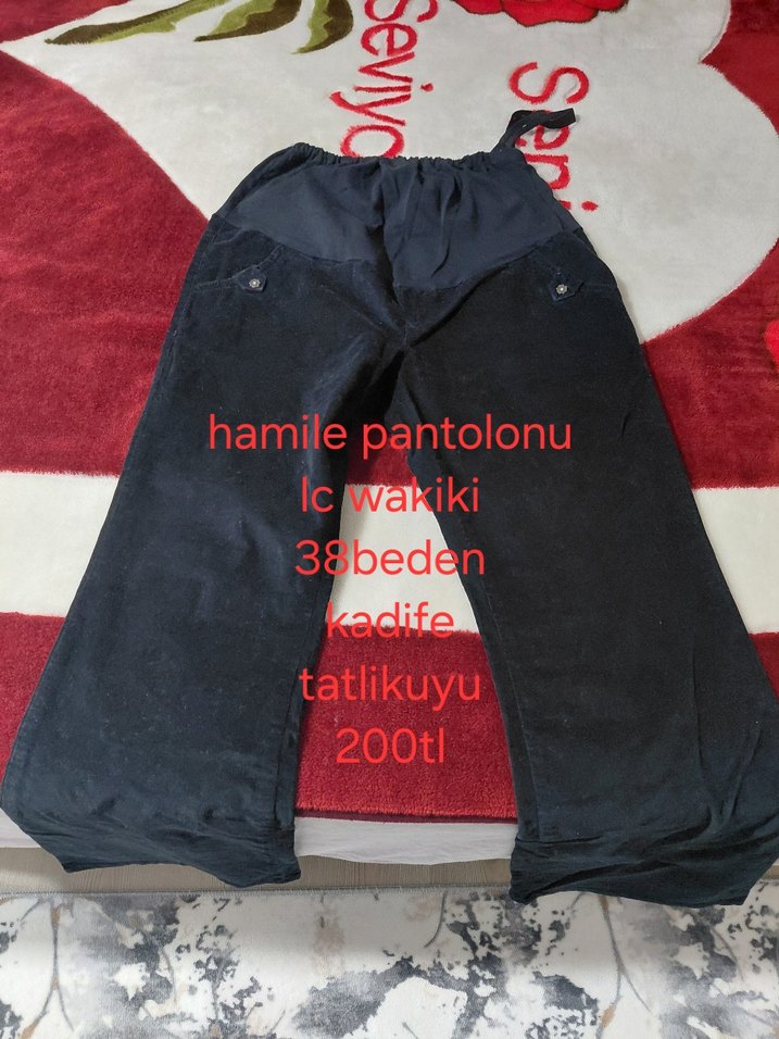 Siyah kadife kumaştan, bol kesim, cırt cırt detaylı 38 beden hamile pantolonu. Günlük kullanıma uygundur. 2si farklı urun .Biri lc wakiki.biri defacto.hamile pantolonu.saglam yırtık sız