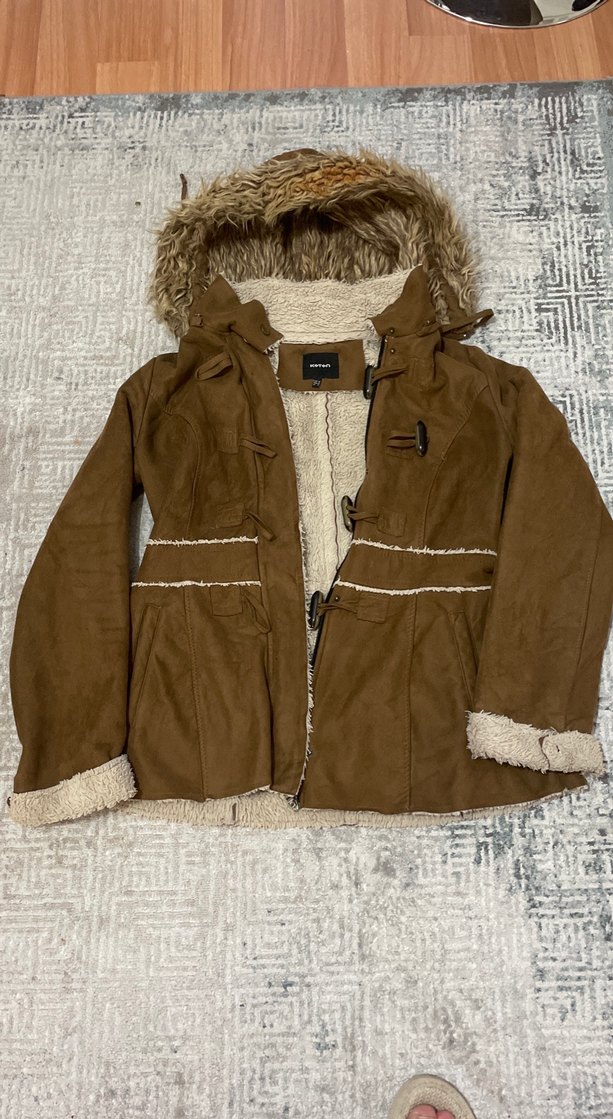 Kadife içi kürklü kaban şapka fermuarlı şapkasının kürkünde ufak bir leke var