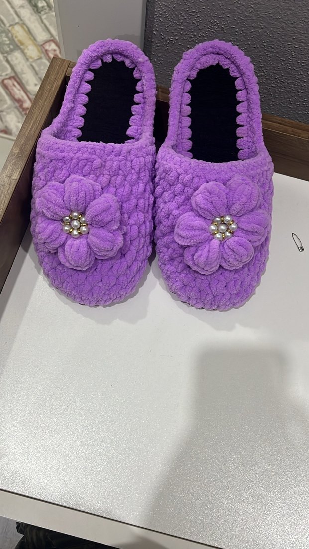 Mor örgü kadın terlikler, çiçek nakışlı detaylarla ve ince topuklu, rahat ve renkli bohem tarzda.