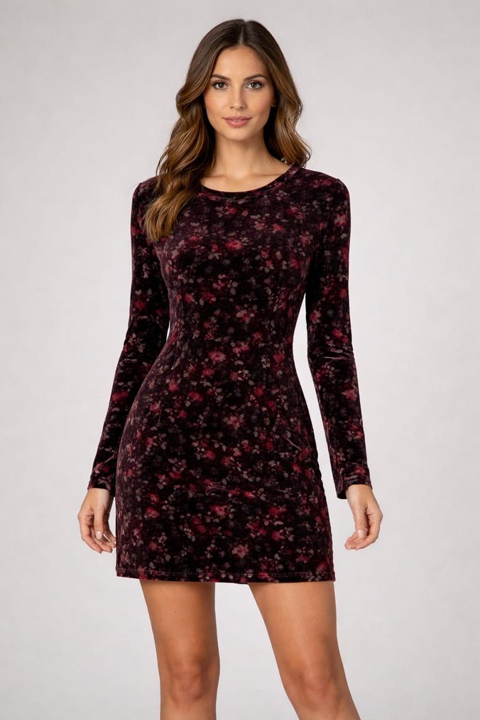 Bordo renkli, uzun kollu, yuvarlak yakalı, dantel detaylı ve koyu tonlarda batik desenli, vücuda oturan mini elbisedir.