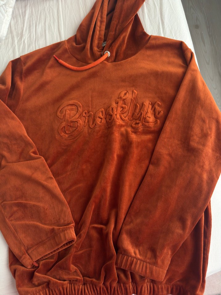 Kahverengi kadife kumaştan, uzun kollu, yuvarlak yakalı ve bol kesim kadın sweatshirt. Nakışlı 'Brooklyn' yazısı ve düğme detaylarıyla bohem tarzda.