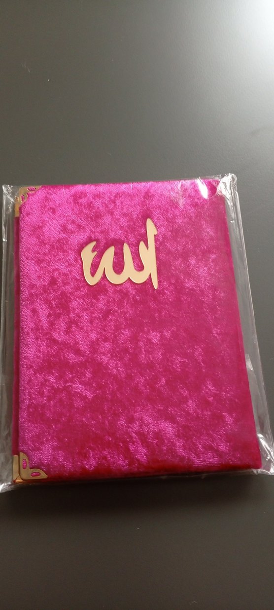 Altın Allah yazısı ve köşe süslemeleri bulunan pembe kadife kapaklı dini kitap. yasin kitabi