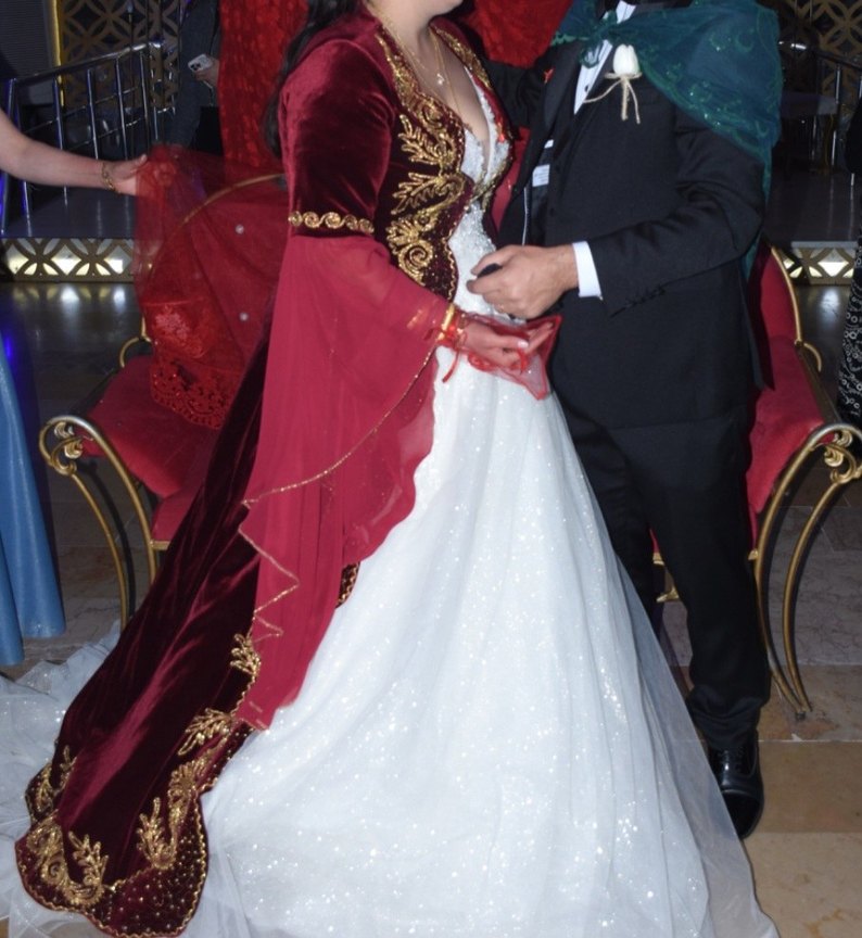 Bordo renkte ve kadifedir. Kol kısımları bi ton daha kırmızı tül çok severek kullandım. Sadece kınada 15 dk giydim hiç bir sorunu yok. L-XL-XXL uyumludur. Kırmızı kına duvağımı kaftanın yanında hediye göndereceğim. Kuru temizleme yapılmadı siz yaparsınız. *marka temsilidir.