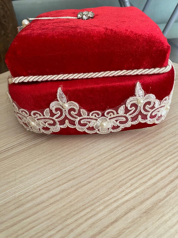 Kırmızı parlak bir kadife tonundadır dekoratif olarak takı toka her türlü ortamda kullanabilirsiniz hiç kullanılmamıştır el işçiliğidir