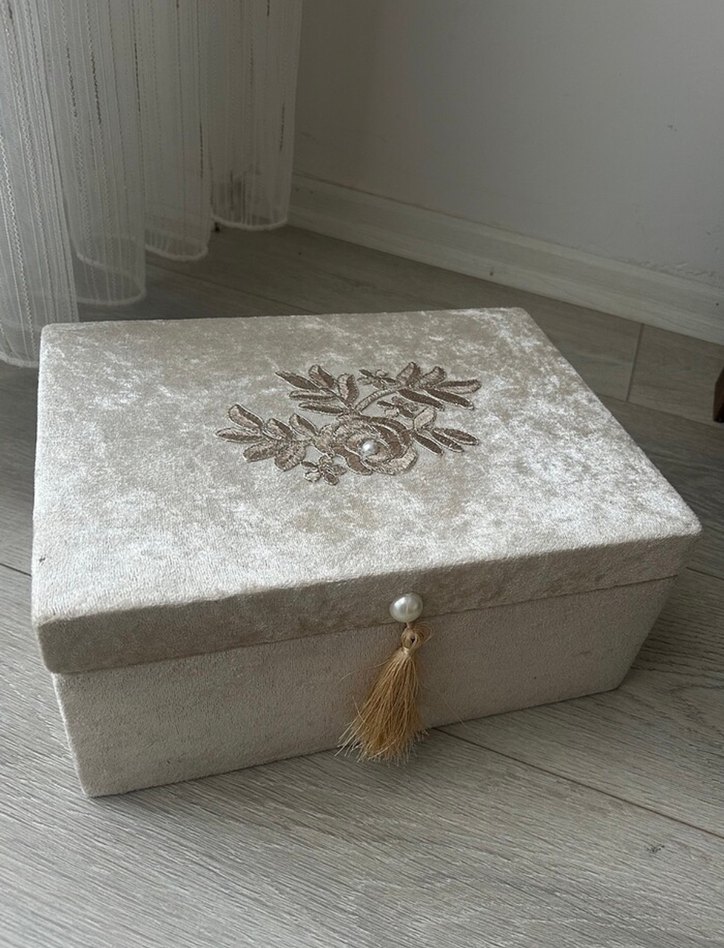 Üstü çiçek nakışlı ve inci detaylı püsküllü kadife makyaj düzenleyici kutusu gelin kutusu