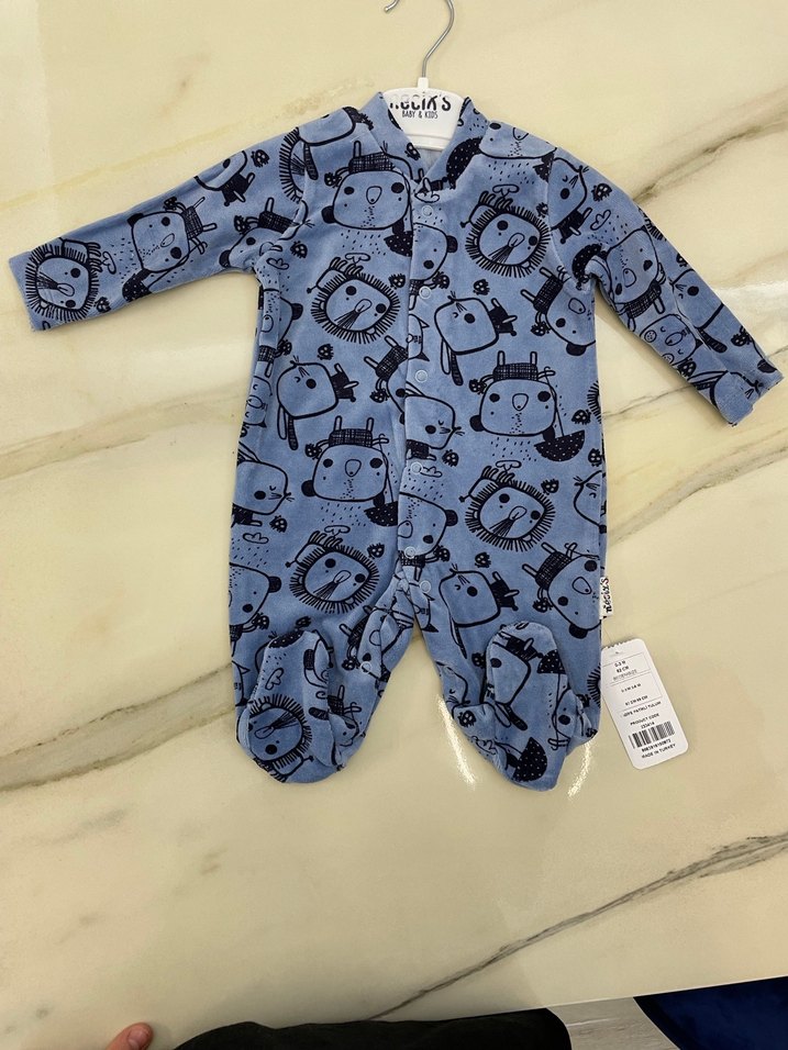 Mavi, uzun kollu, bisiklet yaka ve renkli baskılı desenli bebek tulumu. Yumuşak ve sıcak örgü polar kumaştan üretilmiştir.
