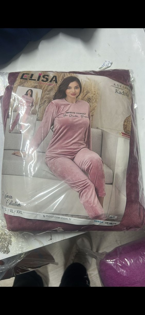 mor kadife kumaştan, uzun kollu ve bol kesimli, baskılı kadın pijama takımıdır. Rahat ve şık bir uyku deneyimi sunar.