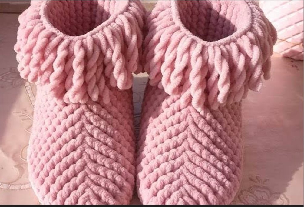 Kızlar için pastel pembe renkte, kalın örgü dokulu sıcak terlikler. Bohem tarzıyla retro ve hippie havası taşır.