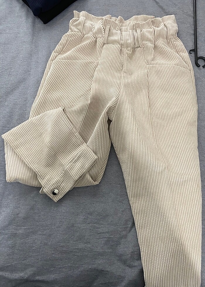 Bir kere giydim yüksek bel lastikli paçaları düğmeli.