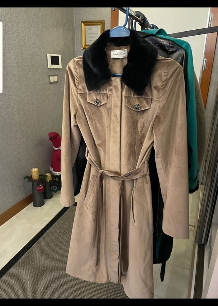 Kadife peluş detaylı ince kaban