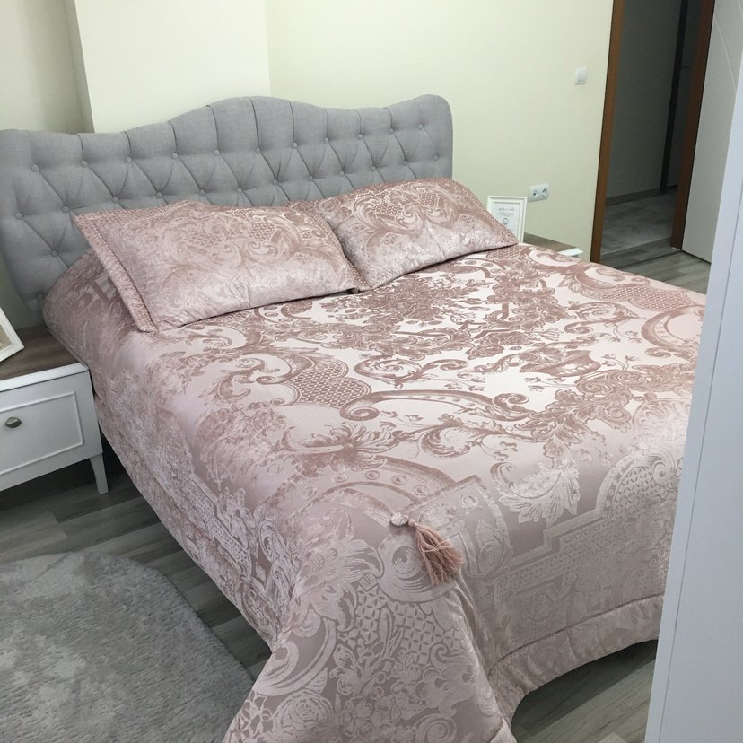Pastel pembe, işlemeli desenlere sahip yatak örtüsü, yatak odasına yumuşak ve şık bir dokunuş katıyor. Uyumlu yastık kılıfları dahil. ️