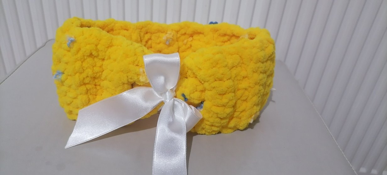 Kadife ipten, sarı renkli el örgüsü çocuk saç bandı, beyaz mavi fiyonk detayına sahiptir ve saten fiyonk kış gunler İçin ideal rahatlık ve sıcaklık sağlar.