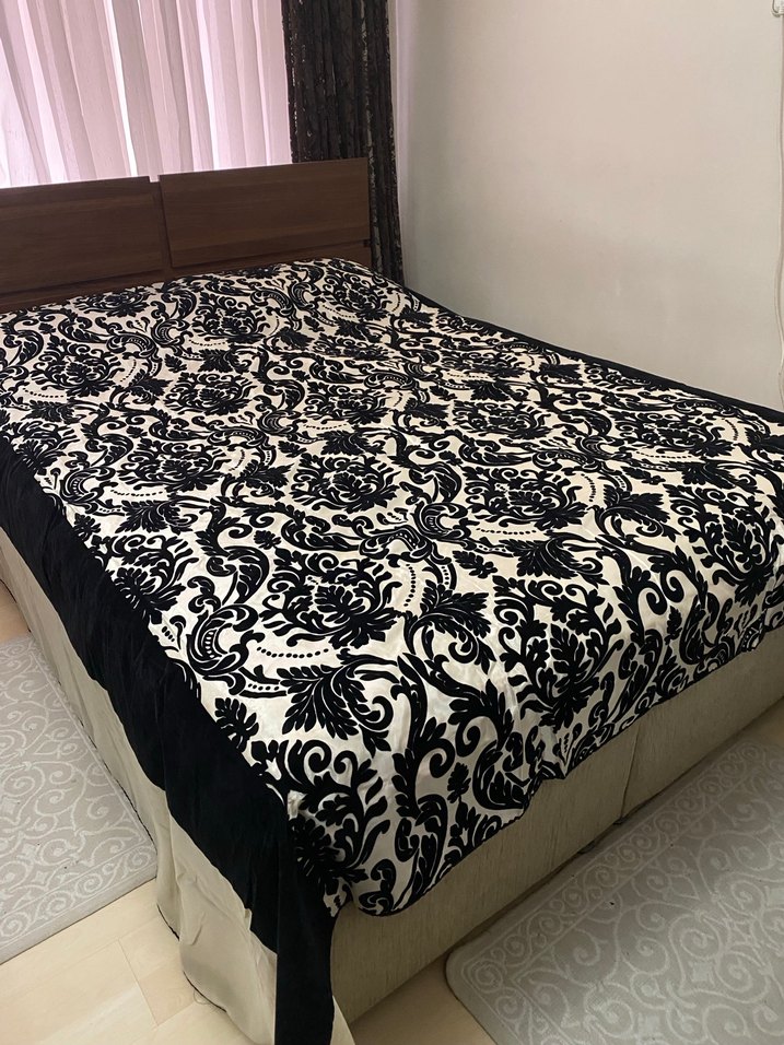Yumuşak dokulu siyah desenli yatak örtüsü, yatak odanıza şıklık katar. ️ 225*275 ölçüde kadife kabartmalıdır. Yan tarafınının birinde saten kumaşa ekleme vardır ve kadife aşınması olmuştur foto ekledim #yatakörtüsü #örtü #masa #yatak