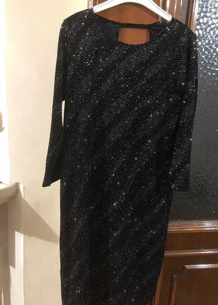DOROTHY PERKINS marka. Karton etiketi yoktur. Yeni, sıfır ürün. Siyah kendinden ışıltılı simli kadife kumaş. Özel günler için harika midi boy elbise. Hafif bir esnek kumaş. Koltuk altından Eni:44cm. omuzdan boyu:92cm. Kol boyu omuzdan:45cm. #150