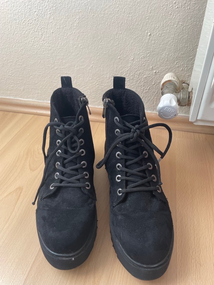 Siyah süet kadın botlar, dolgu topuklu ve kürklü detaylara sahip. Rahat ve gotik tarzda, bağcıklı tasarım, günlük kullanım için uygun.