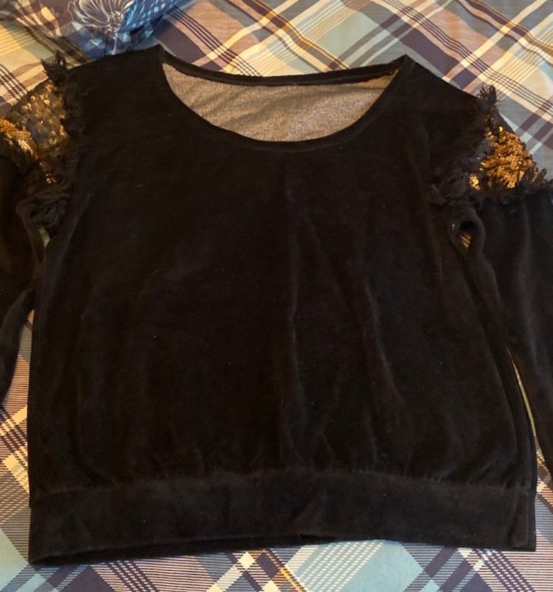 Kadife siyah, uzun kollu, yuvarlak yakalı ve kollarında fırfır detaylı, yumuşak sentetik kumaştan yapılmış, bol kesim bluz.