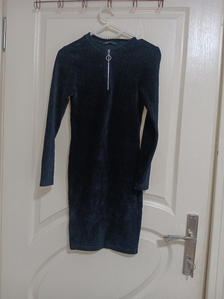 kadife önünde fermuar detayı var siyah renk uzun kollu elbise. günlük kullanım için uygundur şık ve sıcak tutar