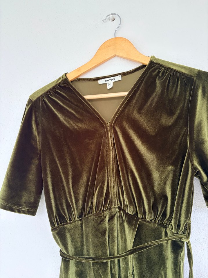 V yaka ve kuşaklı bel detayıyla, parlak haki kadife kumaştan yapılmış, normal boy midi yırtmaçlı görünüme sahip elbise. Bohem ve vintage tarzda, günlük kullanıma uygun.