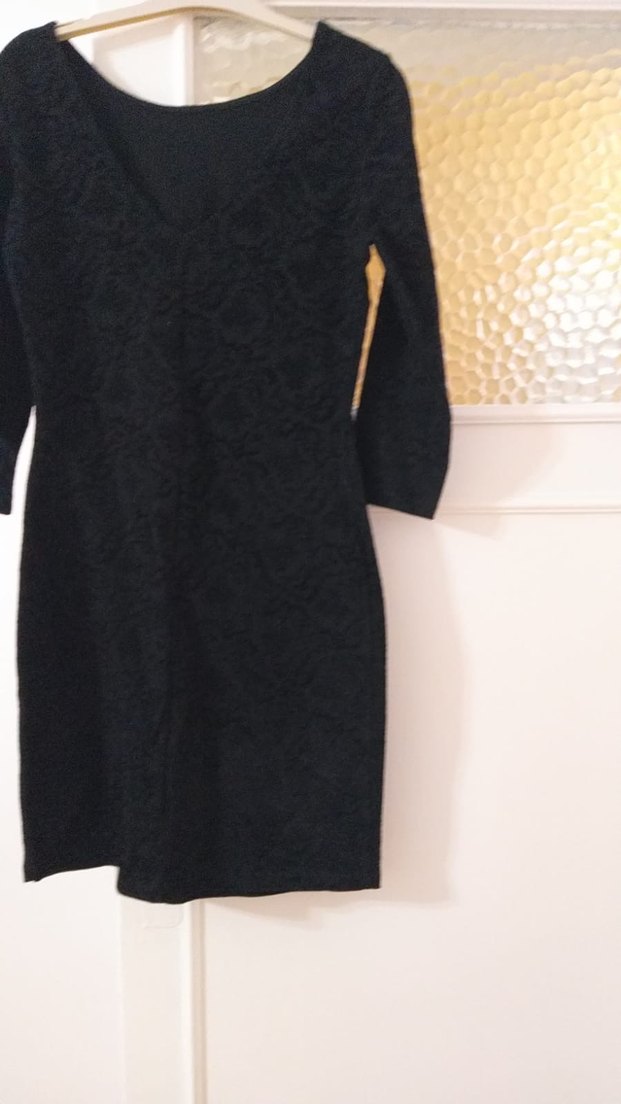 Kadife kabartmalı, arkası V yakalı, kapri kollu, siyah midi elbise. Minimalist gotik tarzda, ofis kullanımı için uygun şık bir model.
