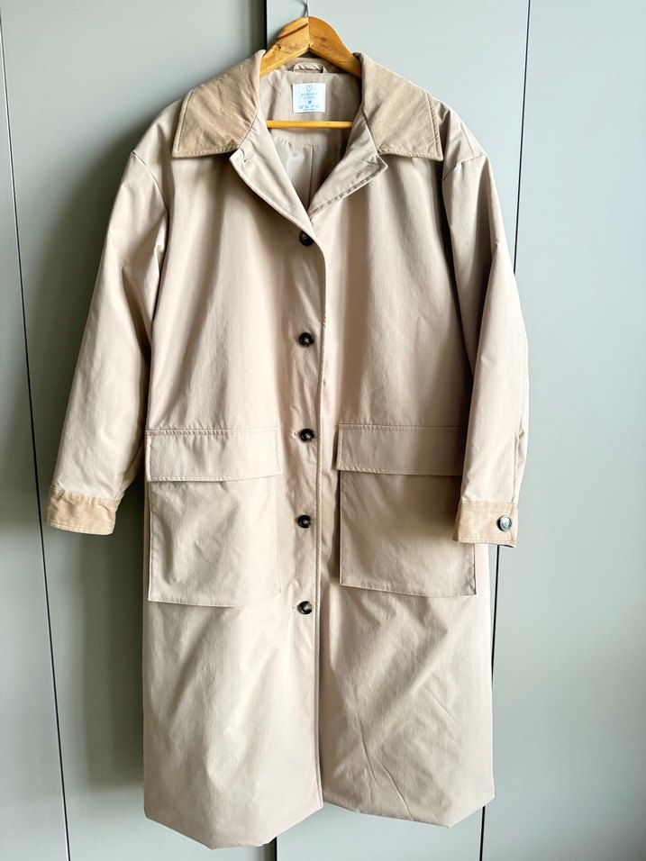 Bej uzun kadın trençkot, düğmeli ve ceplidir. Pamuk kumaştan yapılmış, regular fit ve yakasında notch detay bulunur. Günlük kullanıma uygun sade, kadife kol ve yaka detaylı, oversize. Mont gibi kullanılabilir. #trençkot 40-42 beden