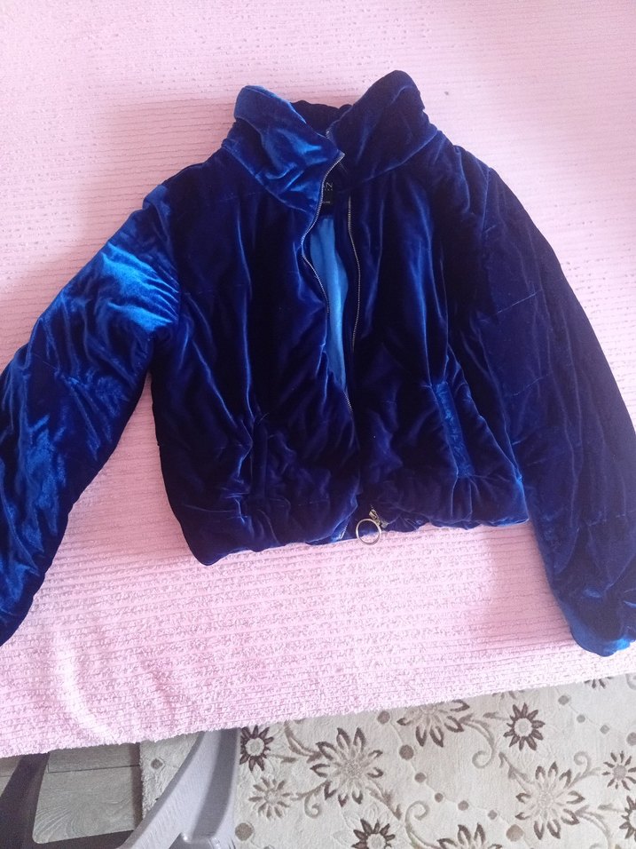 Parlak mavi kumaştan, kadife yüksek yakalı, uzun kollu ve kısa kesim kadın mini ceket. Sokak stiline uygun ve günlük kullanıma ideal.