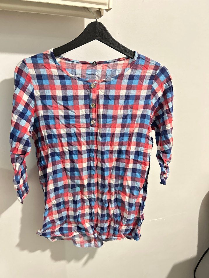 44 beden Kadınlar için çok renkli kare desenli, düğmeli ve uzun kollu pamuklu gömlek. Bol kesim ve yuvarlak yaka ile günlük rahat kullanım için uygundur. #kareligömlek #gömlek