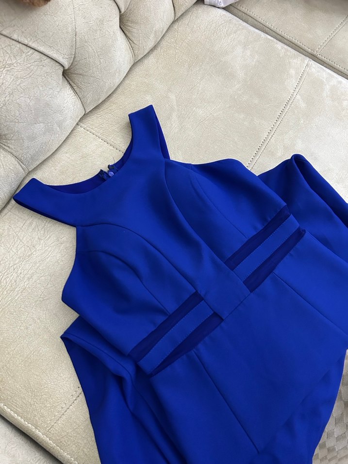 Kolsuz, straplez yakalı ve kemerli bu parlak mavi uzun elbise, modern bir tarzda hiç kullanılmamıştır s M bedenler için uygundur