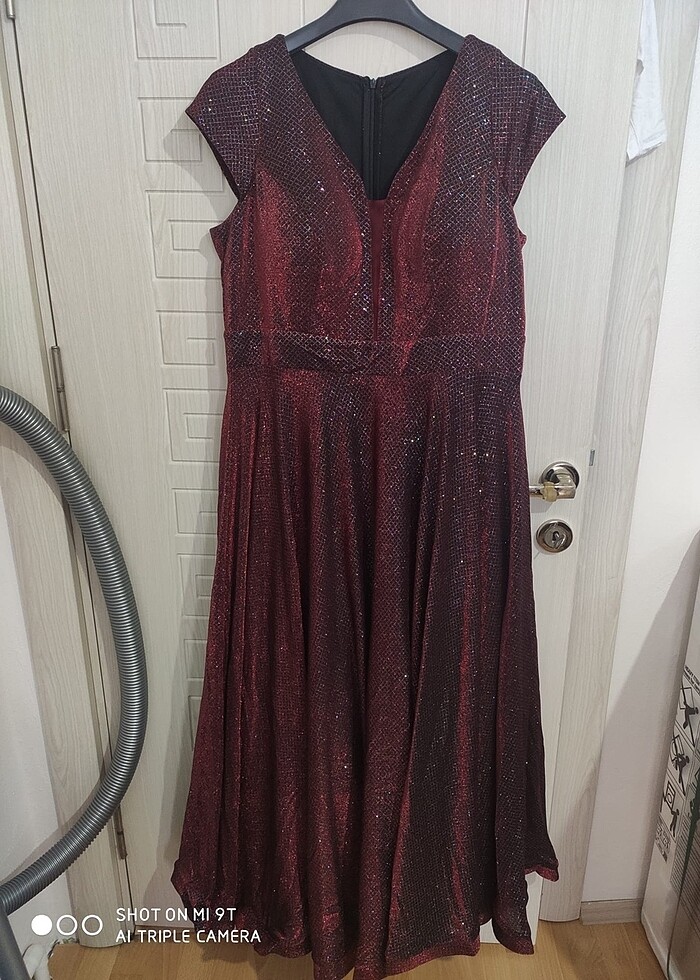 Sadece bir kere giyildi.Hiçbir kusuru yok.Parlak ışığa göre rengini değiştiren bi elbise. Boyu 134-135 cm beli 90 cm.