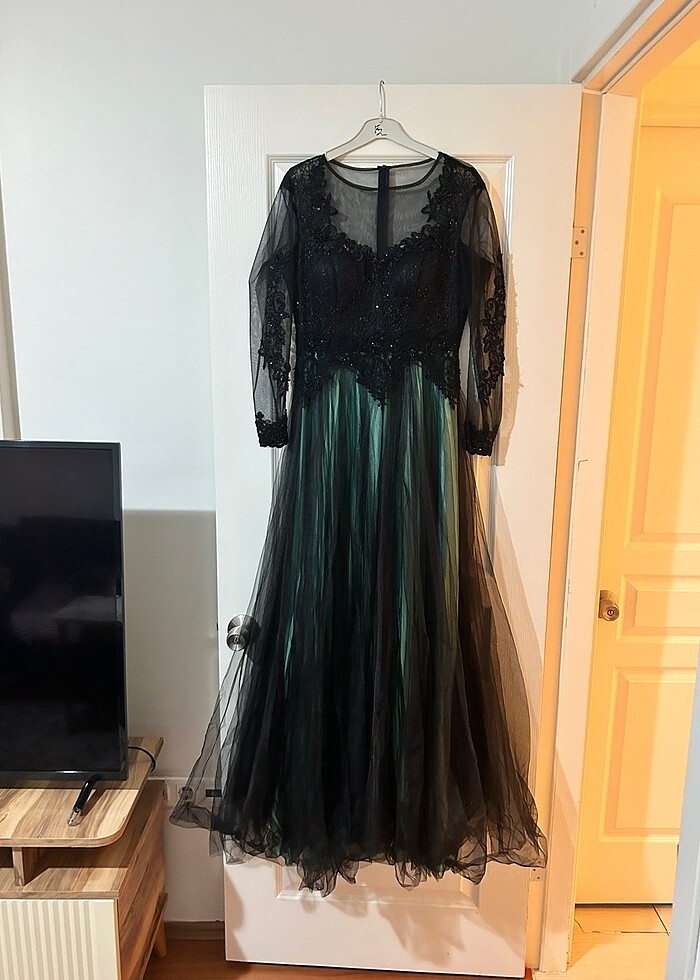 kadın transparan abiye tesettür için de giyinilebilir şalı da mevcut 38 beden yalnızca bir kez giyildi fotoğrafı da mevcut isterseniz ekleyebilirim fiyatta konuşabiliriz siyah ve turkuaz renk