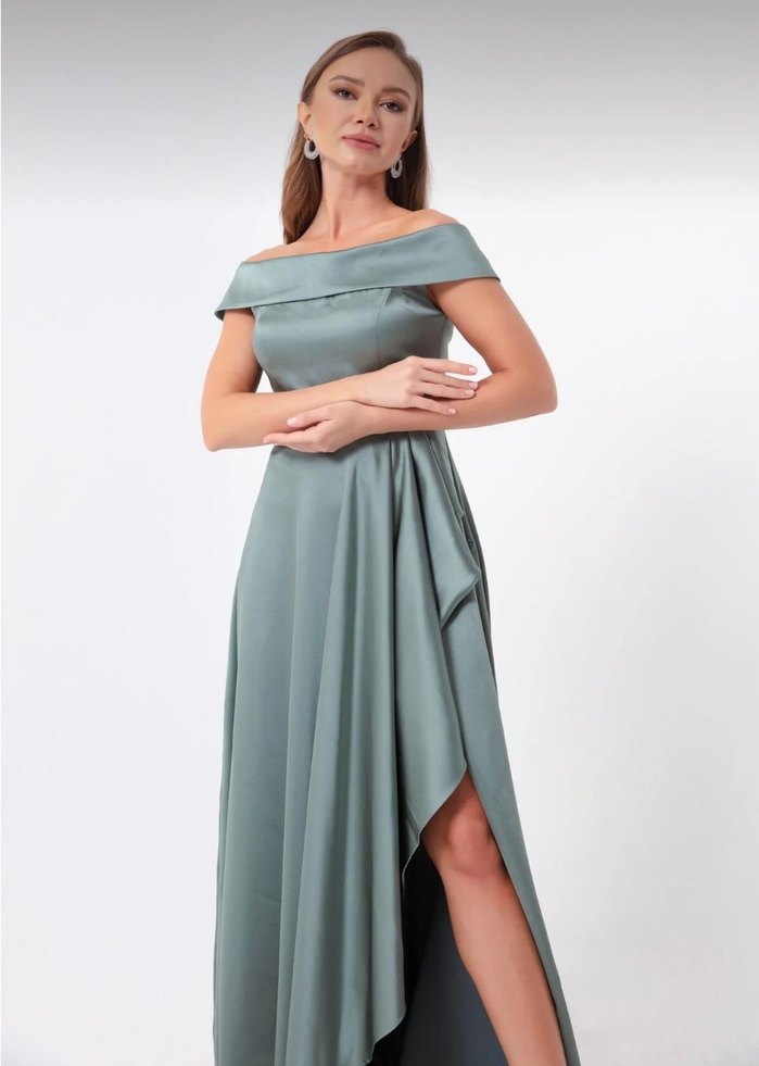 Kadınlar için uzun, drapeli ve omuzları açık tasarımlı gri abiye elbise. Strappy kollu, normal kesim ve yırtmaçlı, düğünler için uygun .Boy ölçü:1,42 cm.Kızım 1 kez kuzeninin düğünün de giydi temiz ,sorunsuz ürün.