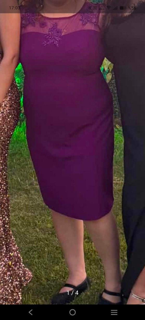 Mor renkte, drapeli tasarıma sahip, sentetik kumaştan yapılmış, diz boyu ve vücuda oturan