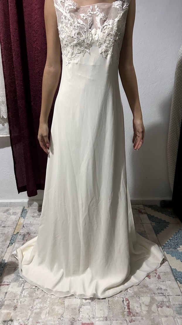 İtalyan marka çok sade ama çok şık gelinlik.Üstü dantel güpürdür. Alt saten üstü tül detaydır.
