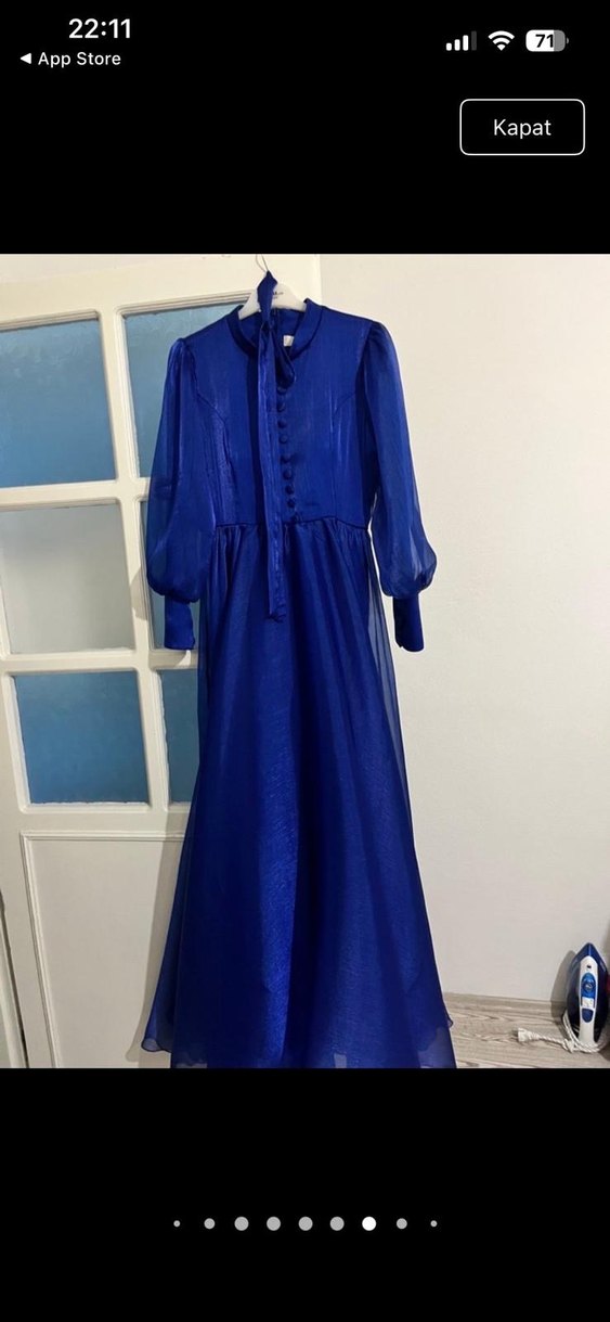 Kadınlar için parlak mavi kumaştan, yüksek yakalı ve uzun kollu, düğmeli, bol kesim modern klasik tarzda uzun abiye sadece düğünde kullanıldı rengi saks mavi