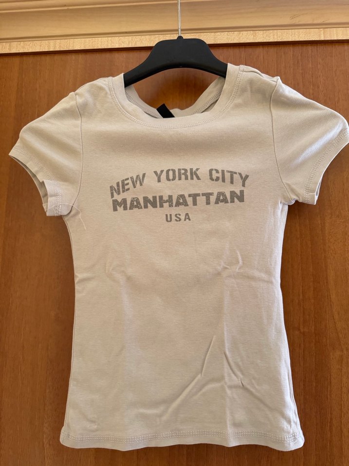 H&M marka, %100 Pamuk kumaştan, kısa kollu ve bisiklet yaka olan bu kadın tişörtü gri renkte ve koyu gri baskılıdır. 'NEW YORK CITY MANHATTAN USA' yazısı bulunur. Xs bedendir. Sadece 1 kez giyildi.