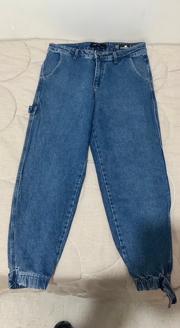 Açık lacivert renkte, kemerli, bol kesim ve normal boy midi kot pantolon. Günlük kullanıma uygun, desen içermeyen rahat bir model.