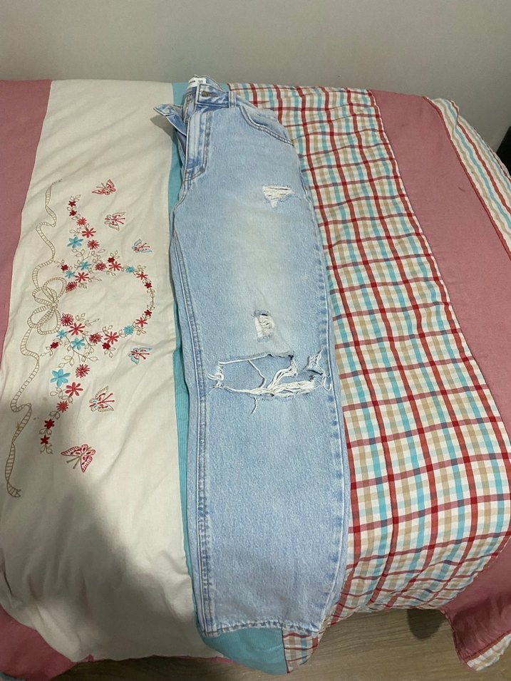 Açık mavi kot pantolon, bol kesim ve tokalı detaylıdır. Midi boy ve yırtık detaylarıyla günlük rahat sokak stiline uygundur.
