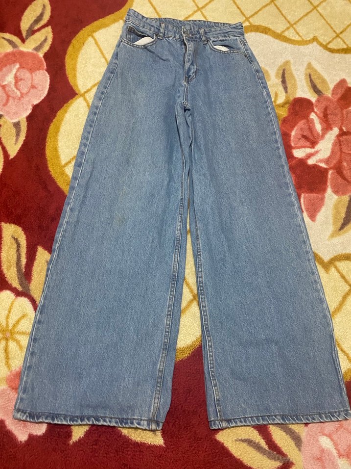 Kadınlar için açık mavi denimden, bol kesim ve normal midi boy kot pantolon. Düğmeli ve günlük kullanıma uygun rahat sokak stili.